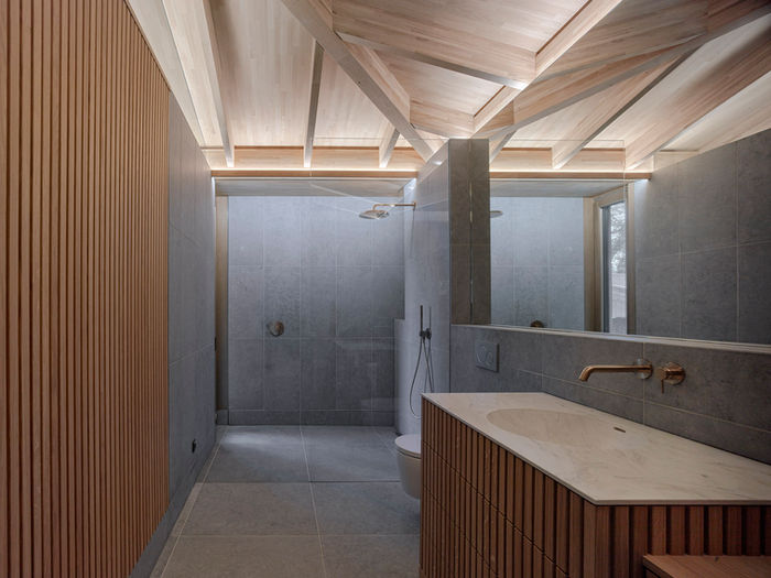 Im Inneren setzt sich die Materiallogik konsequent fort: Sämtliche Einbaumöbel, Wandbekleidungen und Lamellenstrukturen sind aus massivem Eichenholz gefertigt. Die wiederkehrenden Lamellen verbinden Innen und Außen konzeptionell und verleihen dem Haus eine ruhige Rhythmik.
